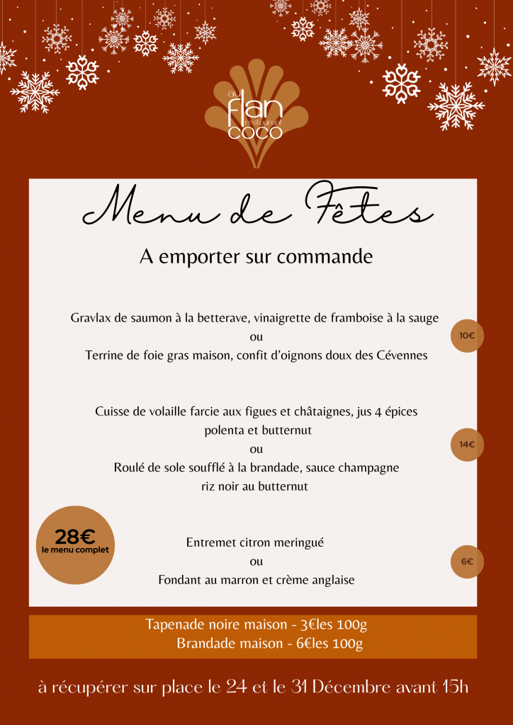 A l’occasion des Fêtes de la fin d’année 2025, nous vous proposons un menu à emporter SUR COMMANDE (par mail ou téléphone)
