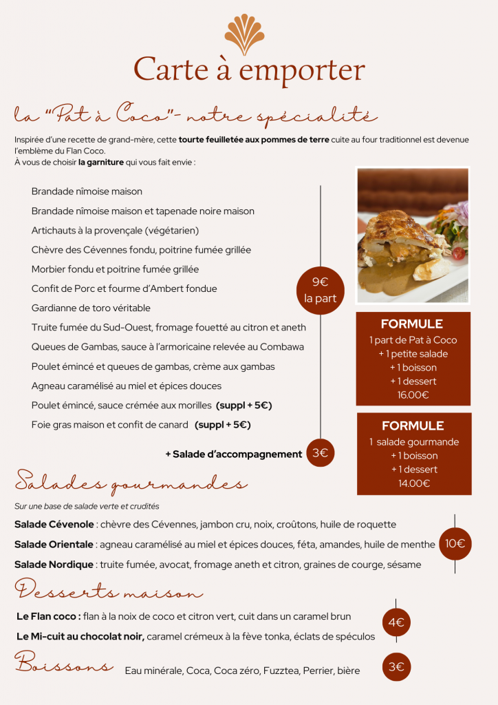 Découvrez nos plats à emporter à Nîmes, cuisine maison, préparés chaque jour avec des produits frais. Au Flan Coco, profitez d’un repas rapide, gourmand et fait maison, à savourer chez vous ou au bureau.